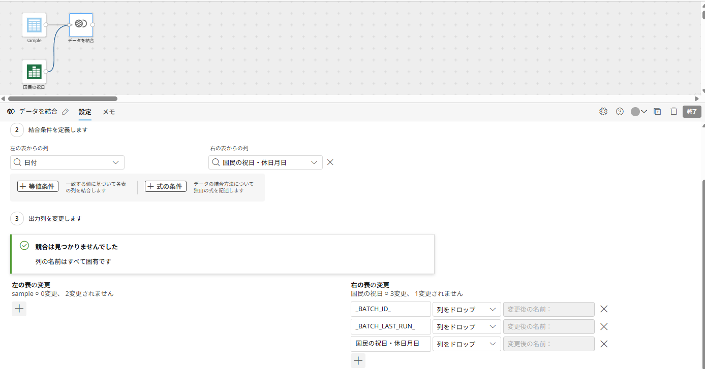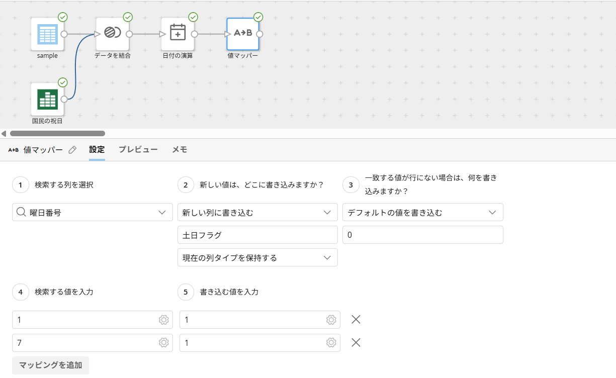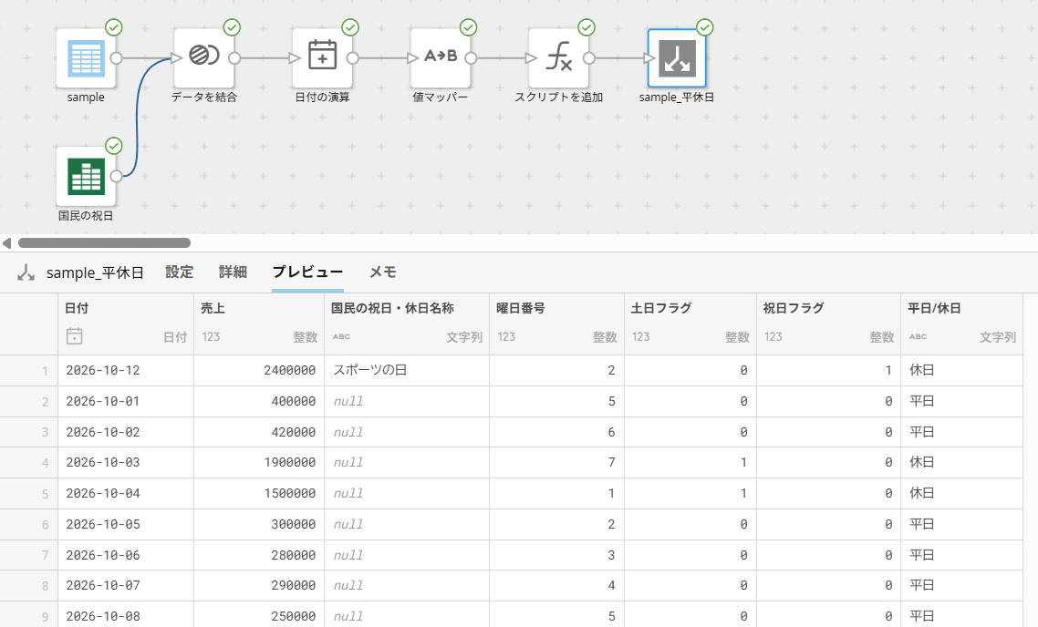 作成した「土日フラグ」と「祝日フラグ」を用いて、平日/休日の判定を行います。