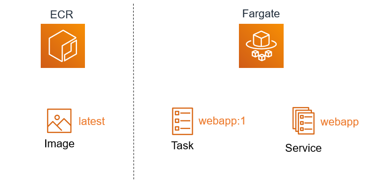 - ECRのDockerイメージのlatestというタグに対して、タスク定義(webapp:1)を作成して、サービスを立ち上げる形にする