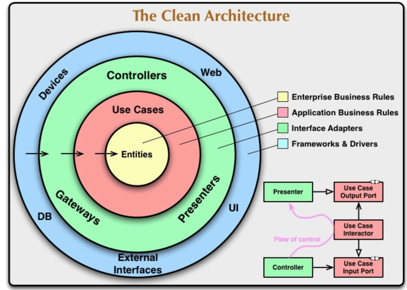 - ビジネスルールが技術的詳細に依存してはならない。技術的詳細がビジネスルールに依存しなければならない