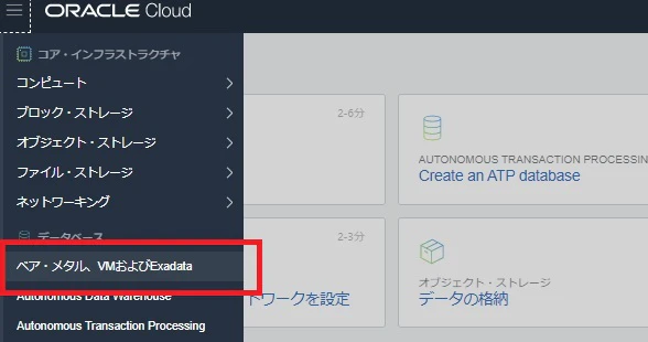 まず、OCIコンソールの左上にあるメニューアイコンから、「ベア・メタル、VMおよびExadata」を選択します。