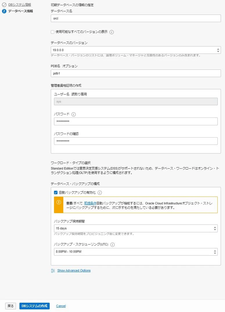 DBシステムの作成画面が表示されます。DBシステムとデータベースの情報を入力します。