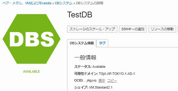 以上を入力し、「DBシステムの作成」をクリックするとDBシステムをプロビジョニングし始めます。アイコンが黄色(PROVISONING...)から緑(AVAILABLE)に変わるとプロビジョニング終了です。