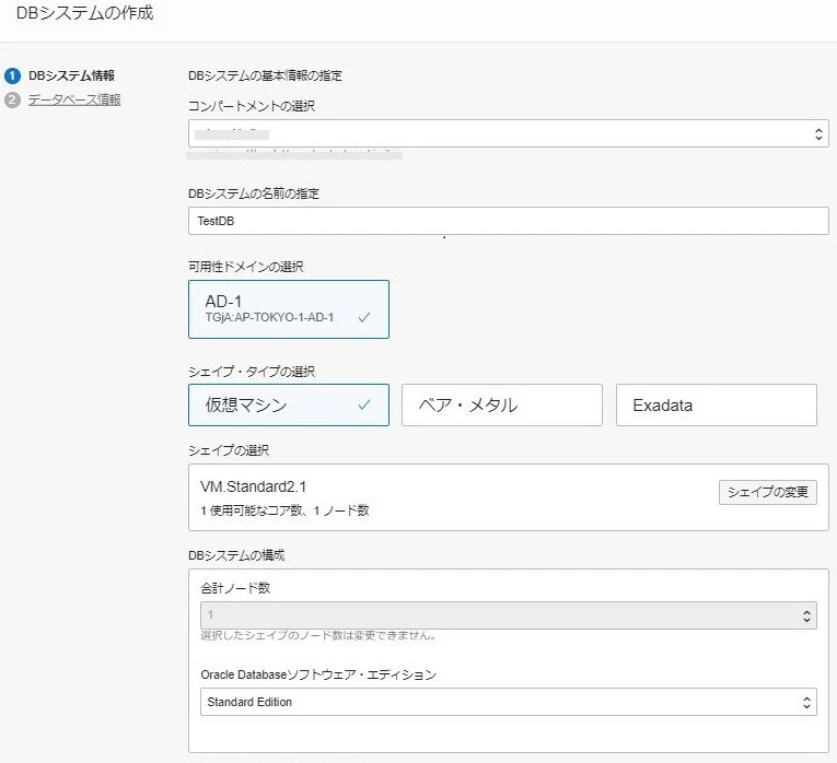 ・コンパートメントの選択 : DBシステムの所属するコンパートメントを選択します。