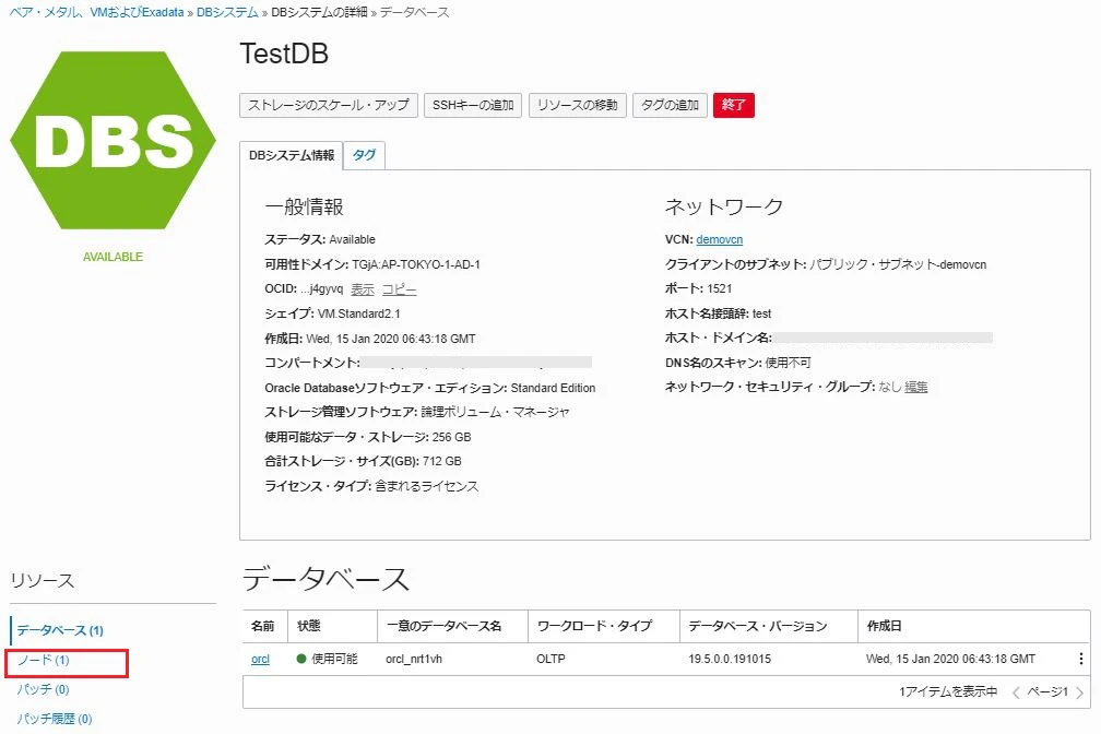 今回、DBシステムを配置したサブネットにパブリック・サブネットを使用しました。そのため、DBシステムにはパブリックIPが割り当てられています。IPアドレスの確認には、詳細ページの左側にある「ノード」のリンクをクリックします。ノードの情報が表示され、パブリックIPアドレスも確認できます。