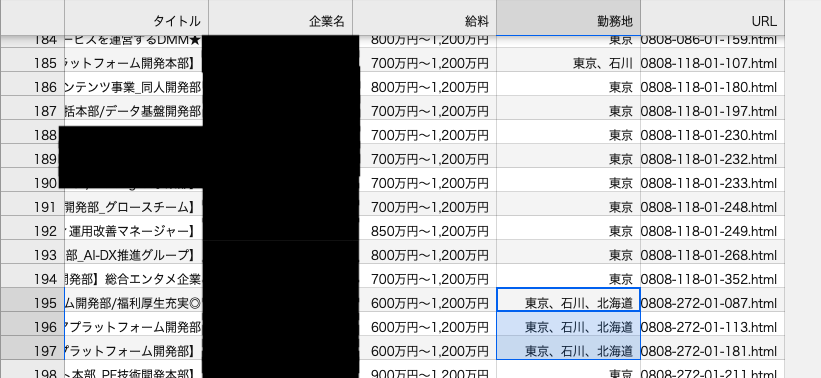 今回は勤務地が複数入力されている場合、分割して新たな行を作成するようにします。(「東京、石川、北海道」とある場合、東京の行、石川の行、北海道の行と3行に分割。)