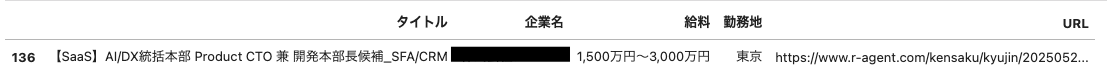 最大の年収の採用情報はインデックス136であり、自動で指定しています。