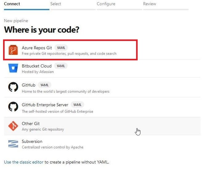 なおリポジトリはAzure Repos以外にも、GitHub、Subversionなども使用可能なようです。