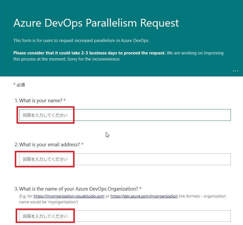申請者の氏名と連絡先メールアドレス、無償利用枠付与を依頼するAzure DevOps組織のURLを入力します。