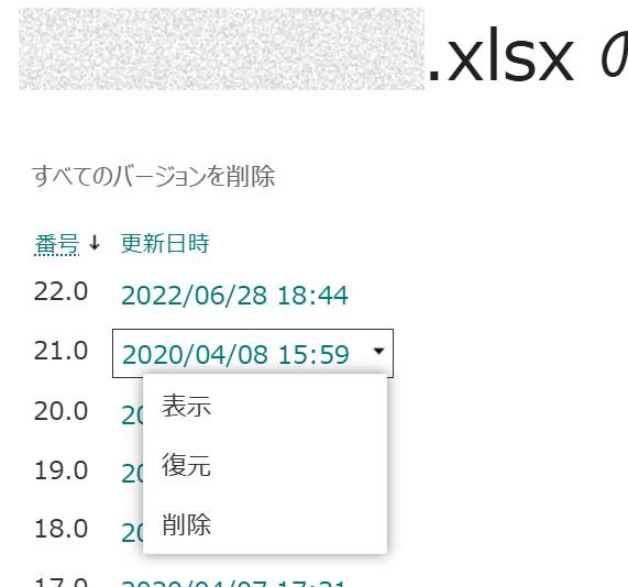 各ファイルの右側にある、「バージョン履歴」を