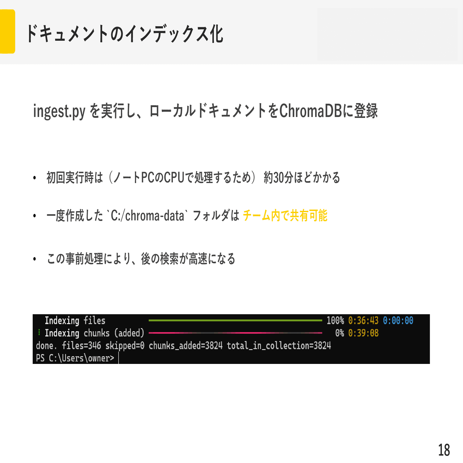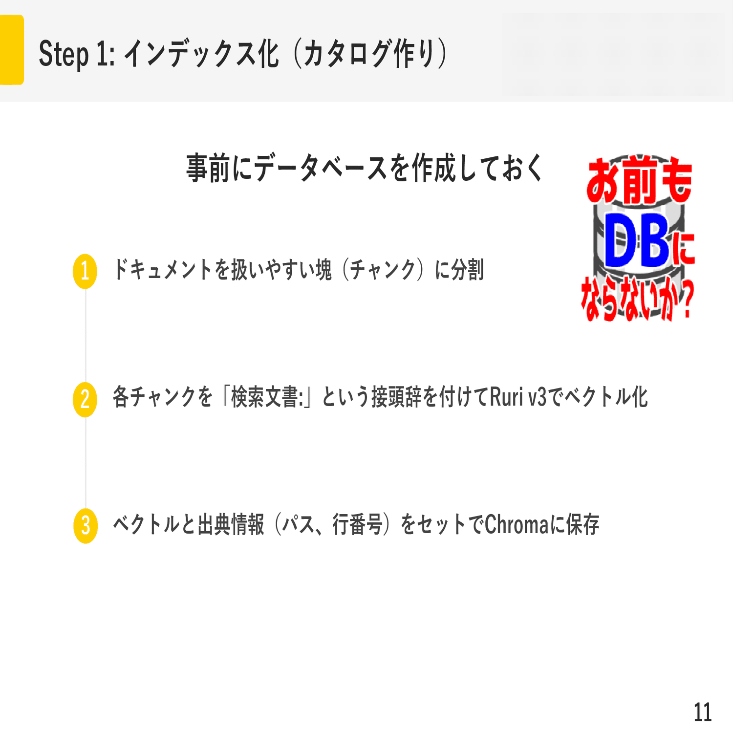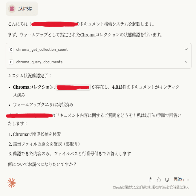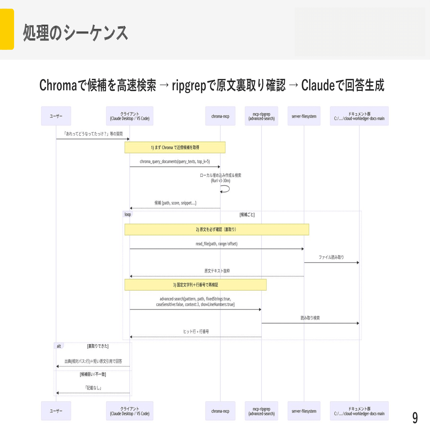 Chromaで候補取得→ripgrepで確証→原文引用を必須化してすることで、ハルシネーション最小化を徹底しています。