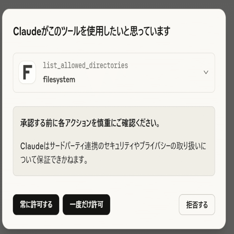 Claude Desktop からはこのフォルダにだけアクセスを許可するので安全です。