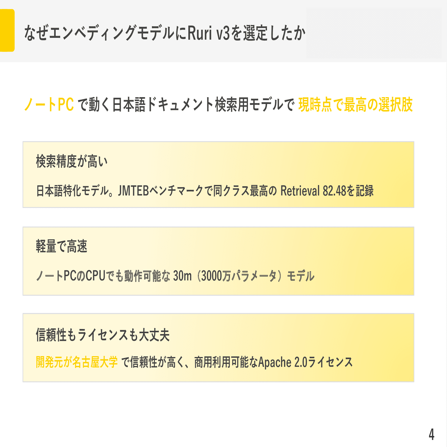 Q. なぜエンベディングモデルにRuri v3-30mを選定したのですか?
