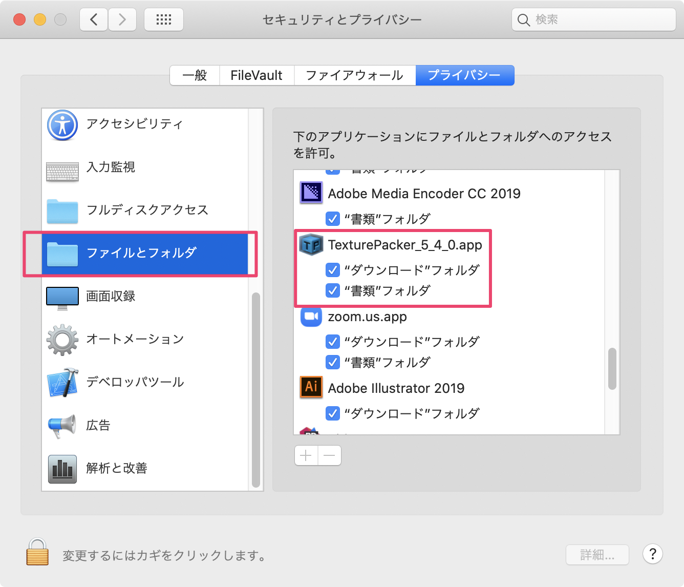 システム環境設定 > セキュリティとポリシー > ファイルとフォルダからTexturePackerを探してアクセス許可状態を確認します。