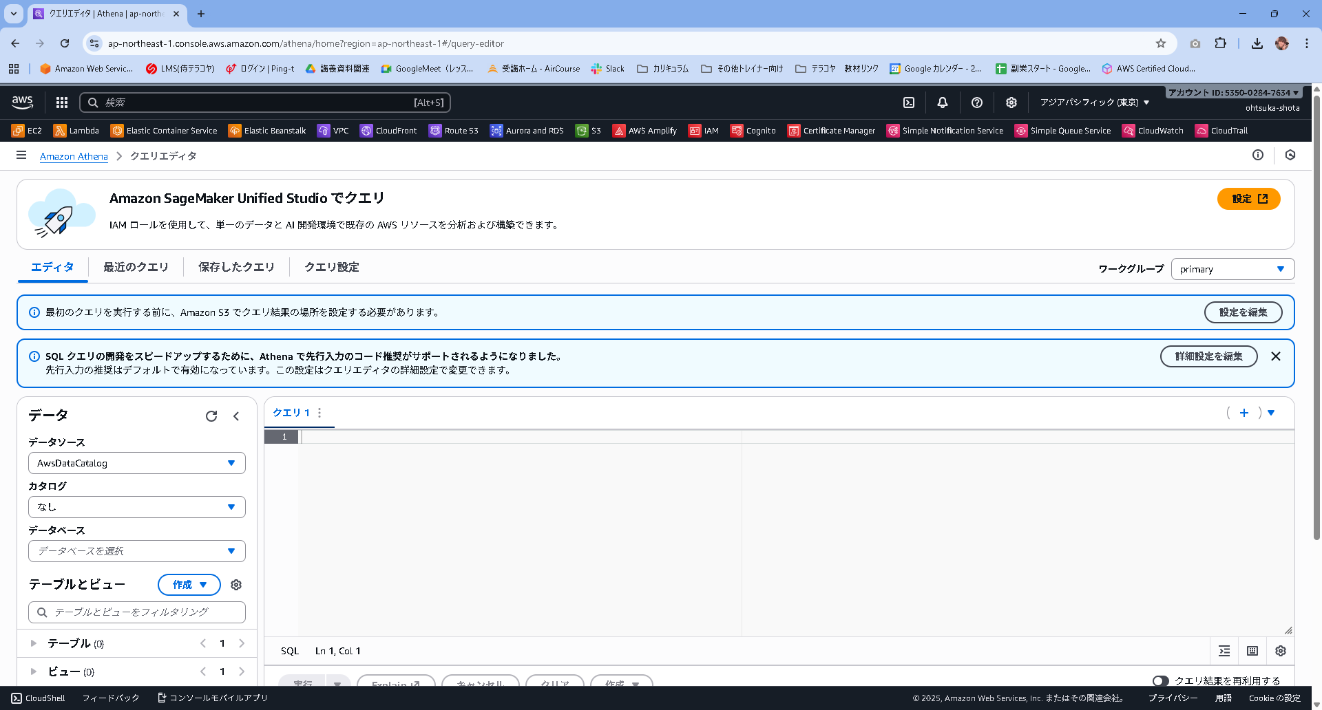 最初はこのような画面になっていると思いますので、「最初のクエリを実行する前に、Amazon S3 でクエリ結果の場所を設定する必要があります。」と記載されている部分の設定を編集を押下します。