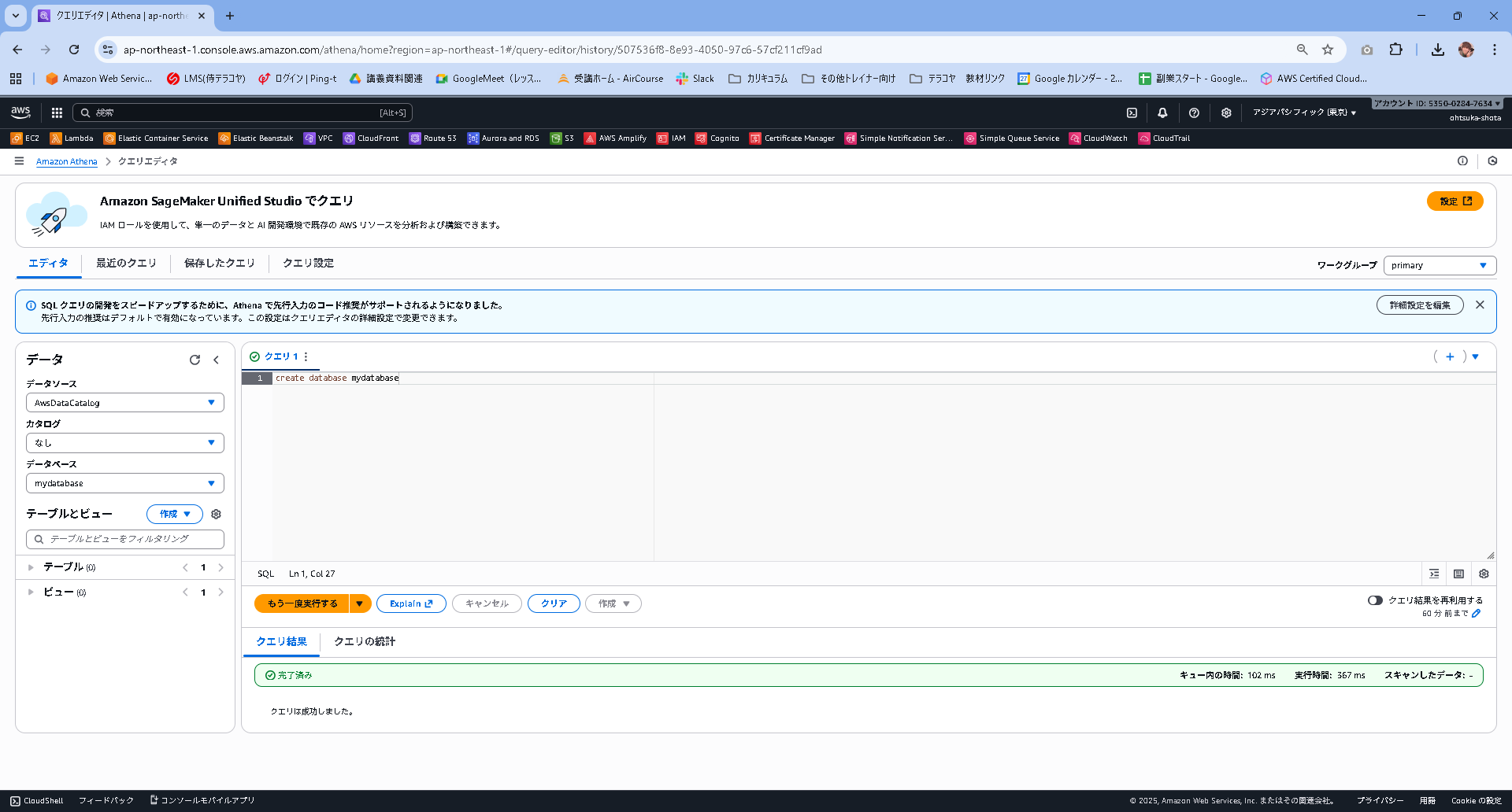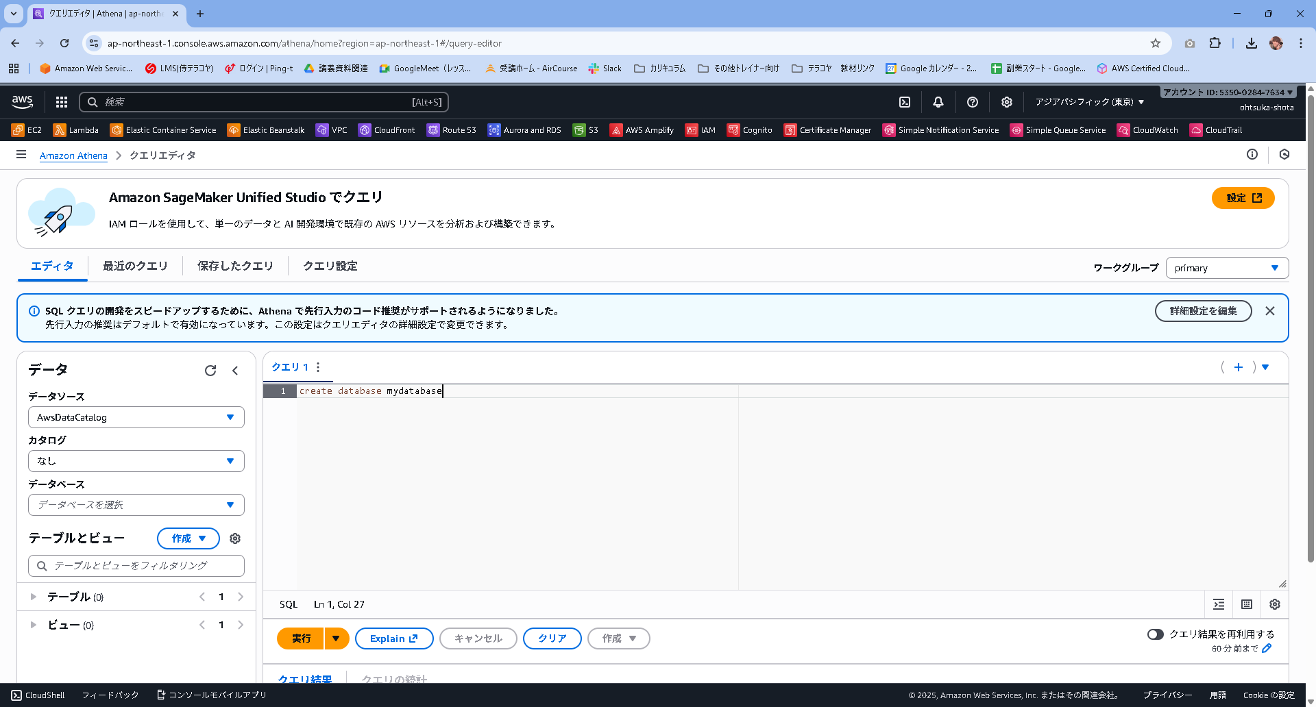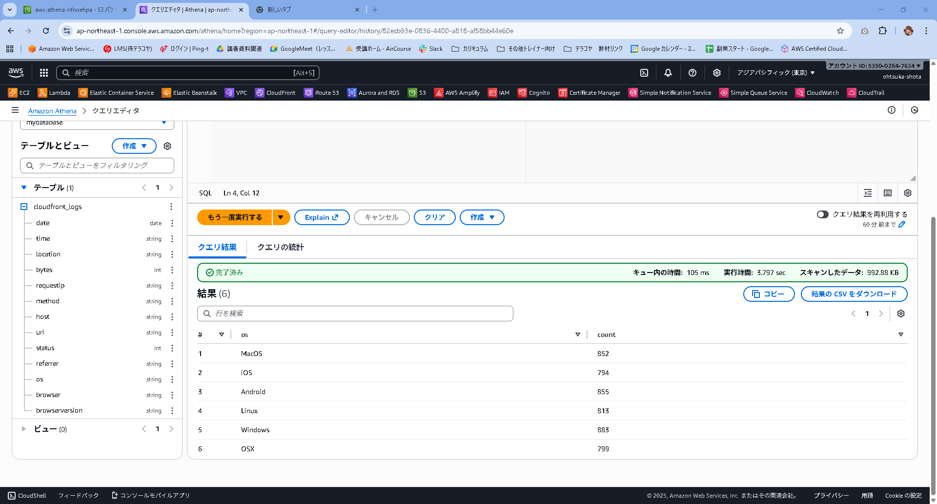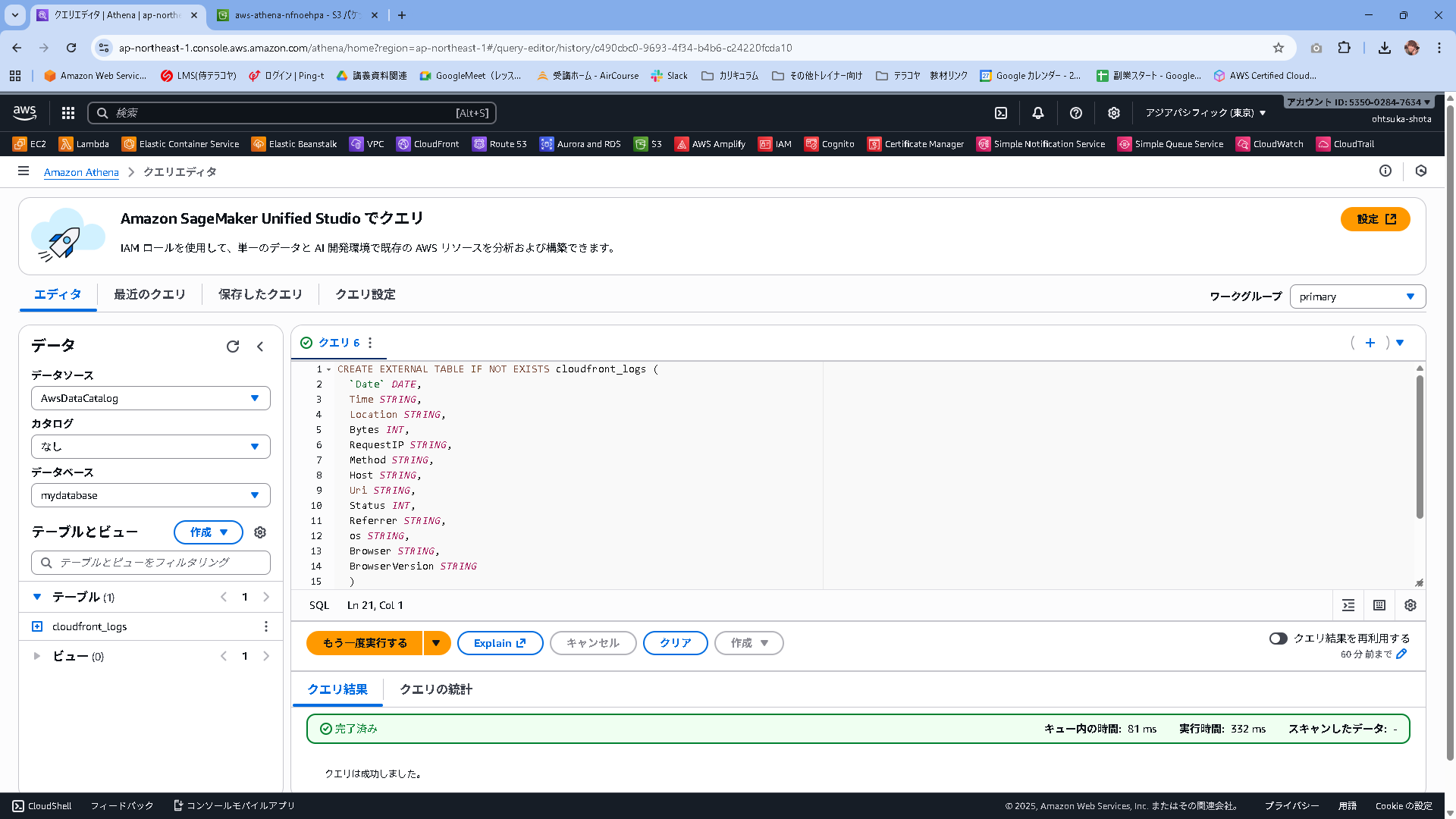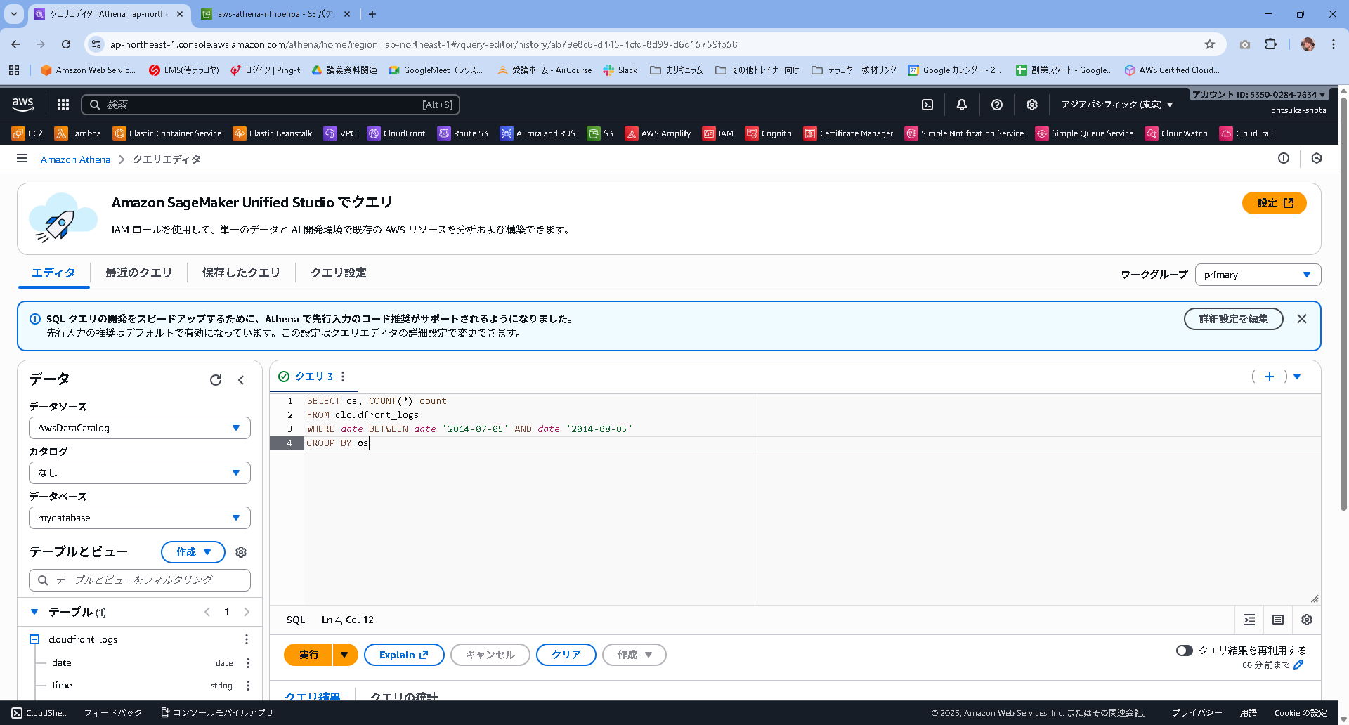 "LOCATION 's3://athena-examples-ap-northeast-1/cloudfront/plaintext/';"のリージョン部分はAthenaを実行している環境に合わせます。