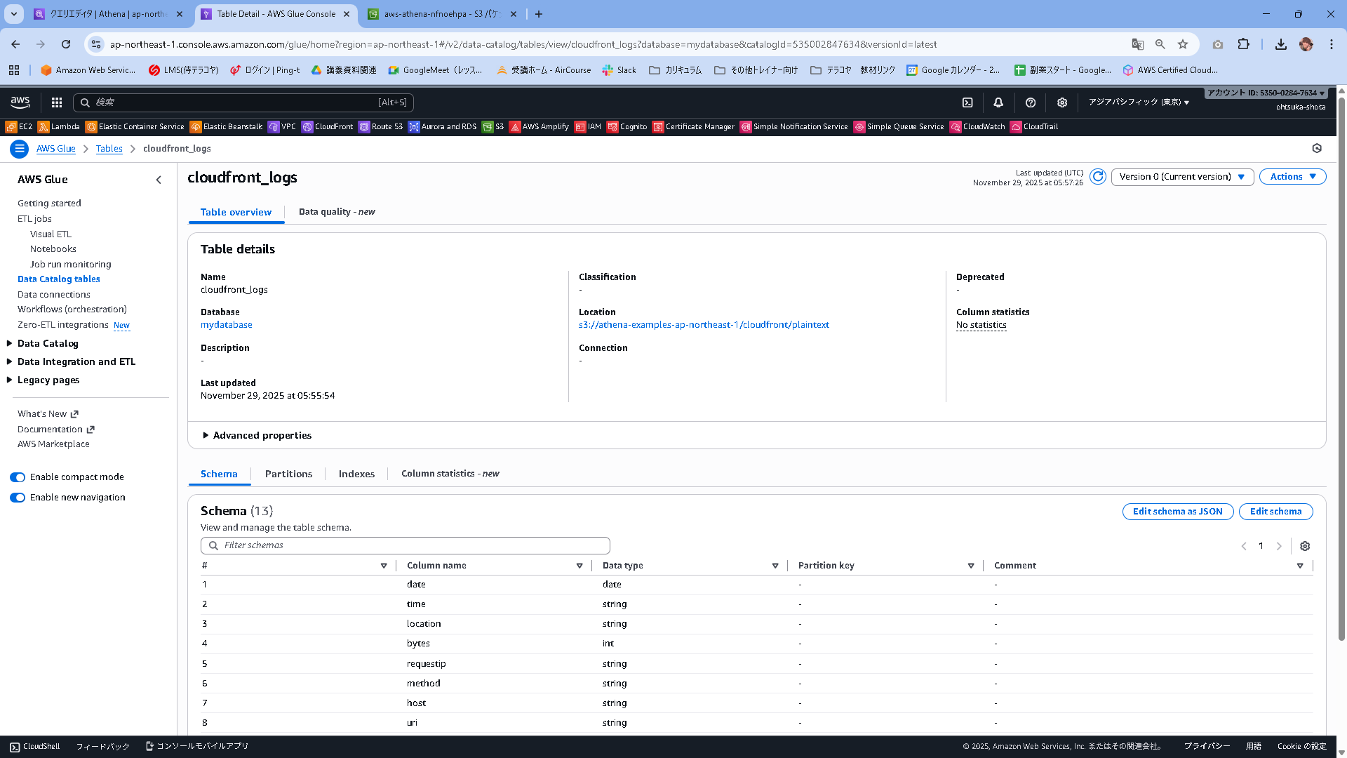 このタイミングでGlueを見てみると、Athenaで作成したデータベーステーブルと、AWS公式のS3に対して紐づけがされていることがTable detailsから見て取れると思います。
