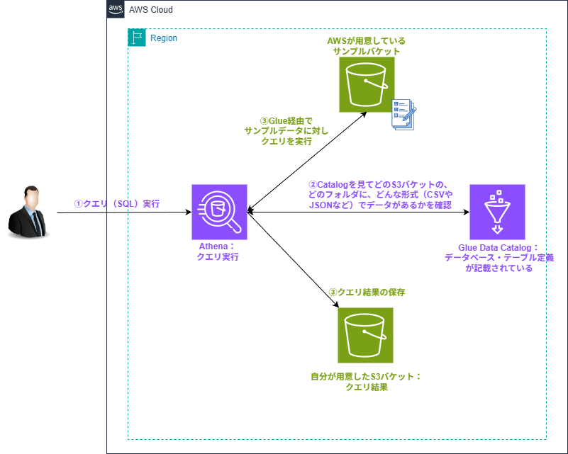 ユーザがAthenaに対してクエリを投げると、Athenaに連携されているGlueを経由して、実際のデータが格納されているS3(今回はAWS公式が用意しているサンプルS3バケット)にSQLクエリを実行します。