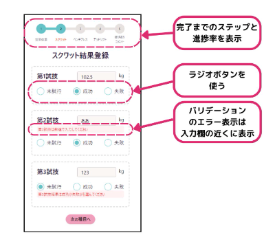 - ステップごとに進行状況が明確になるため、入力の途中で「どこまで入力したか分からない」という状況を防げます。