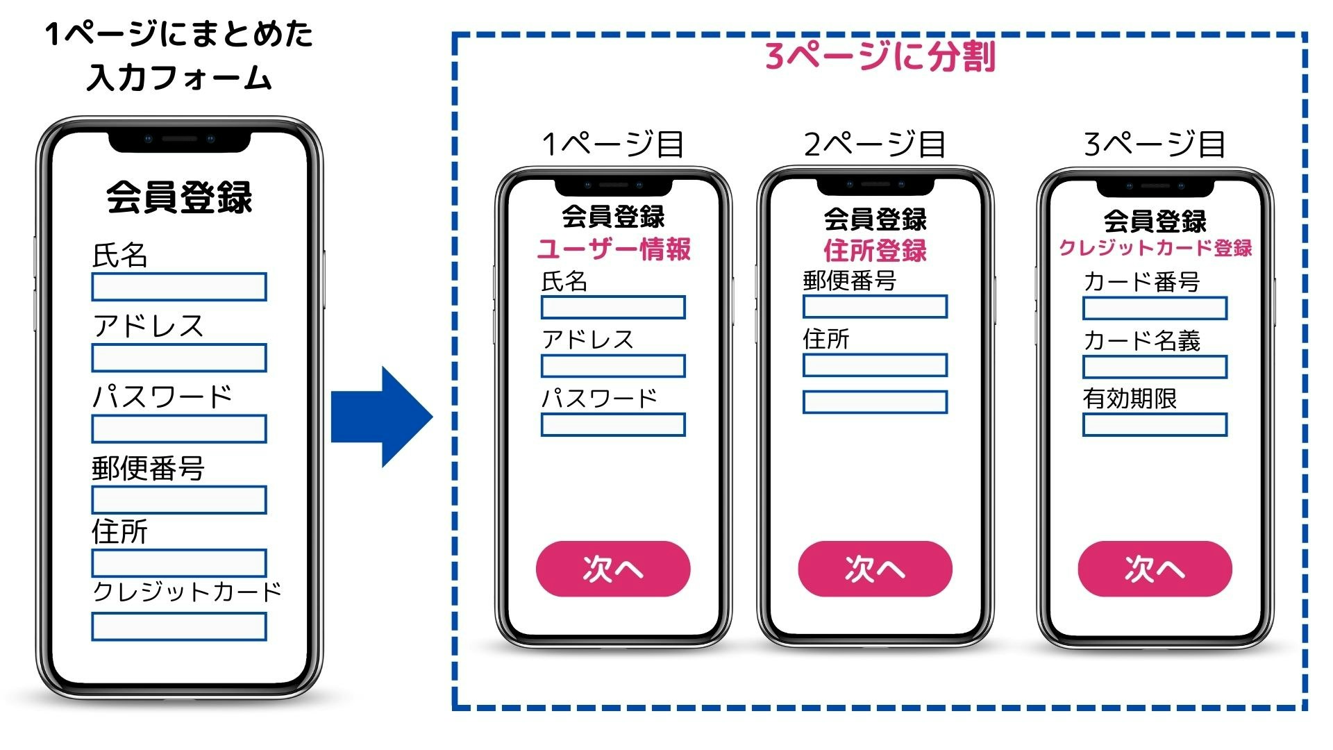ページの分割方法や、画面設計面については後述しますが ステップ入力フォーム化後のafterは以下画像のようになりました。