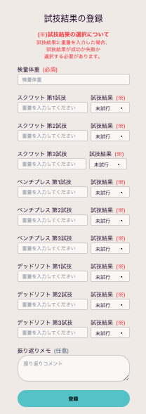 | 2.スクワット試技結果入力フォーム | - squat_first_attempt ("第1試技重量") - squat_second_attempt ("第2試技重量") - squat_third_attempt ("第3試技重量") - squat_first_attempt_result ("第1試技判定結果") - squat_second_attempt_result ("第2試技判定結果") - squat_third_attempt_result ("第3試技判定結果") |