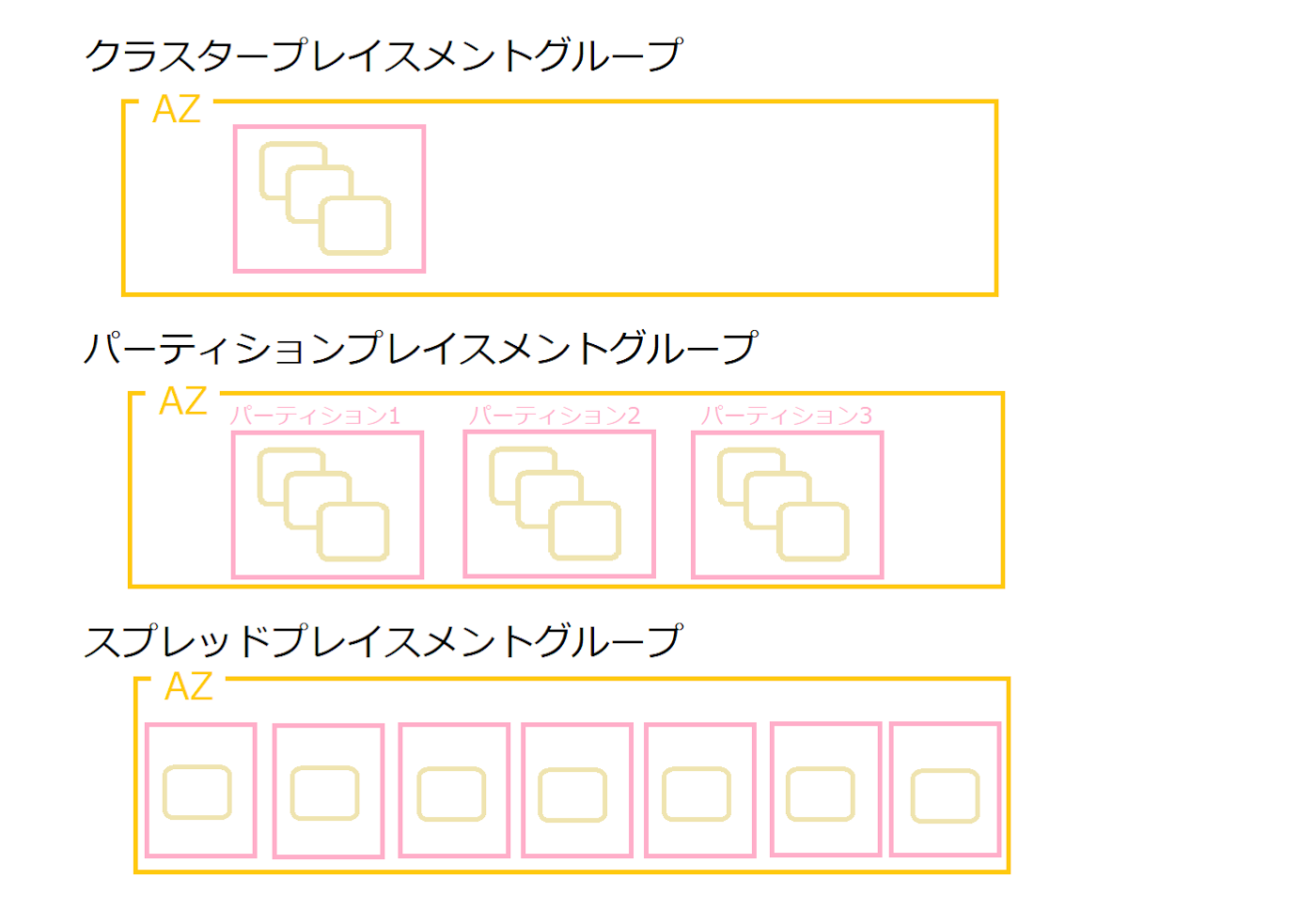 クラスタープレイスメントグループは主にパフォーマンスを向上させるためのもので、パーティションプレイスメントグループとスプレッドプレイスメントグループが耐障害性を高めるもの。