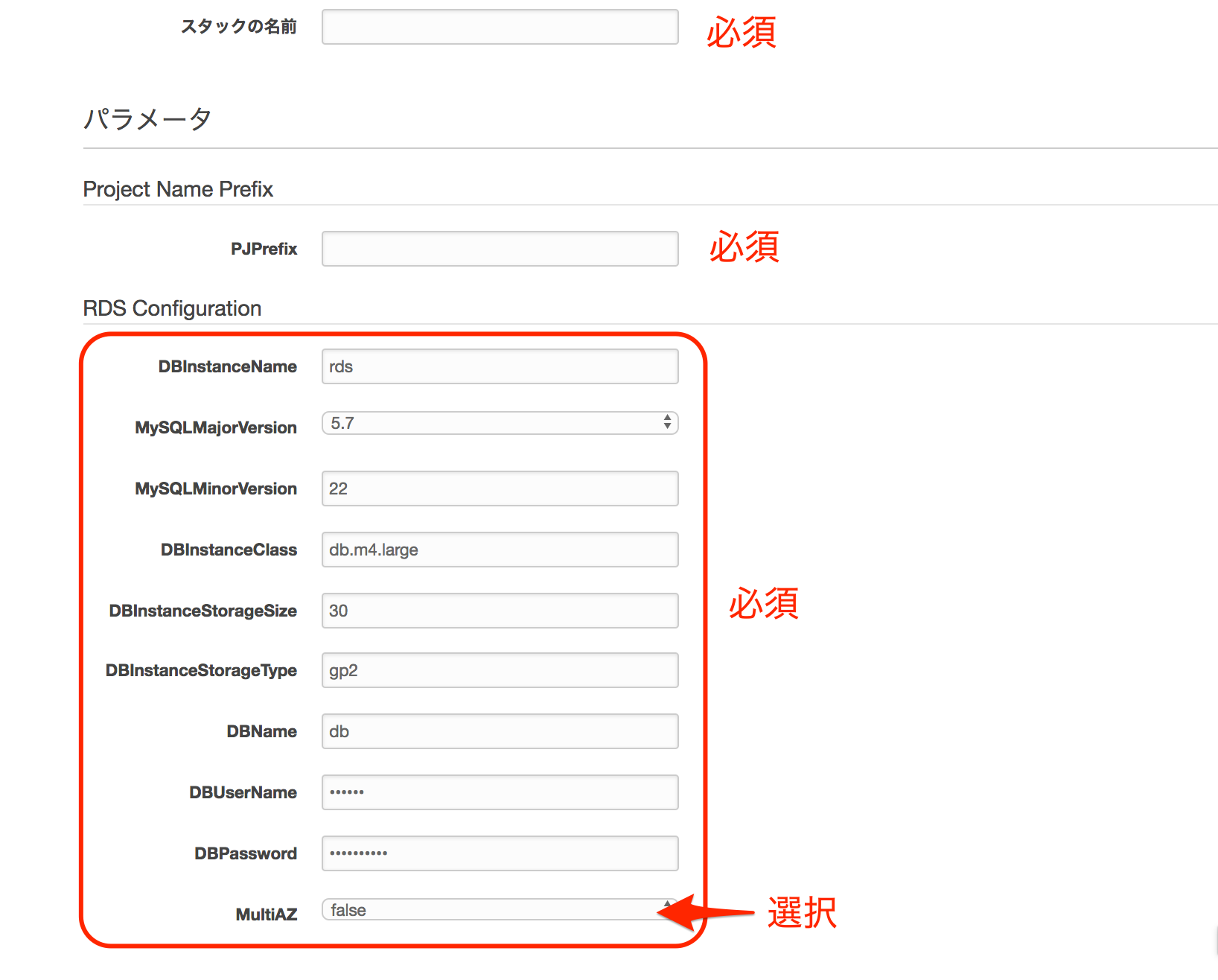 | MultiAZ | MultiAZを有効にする場合は、true MultiAZを有効にする場合は、false |