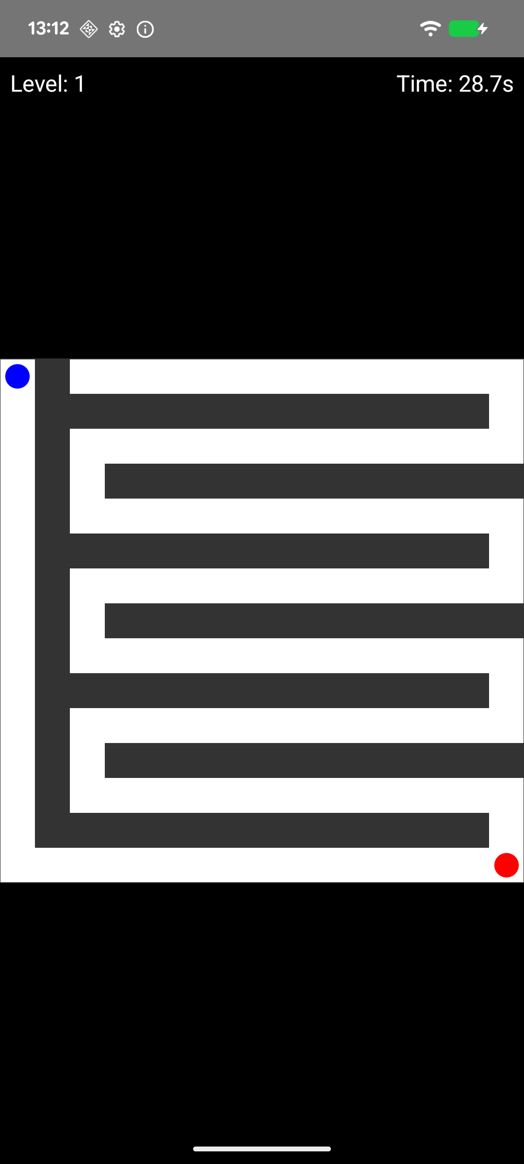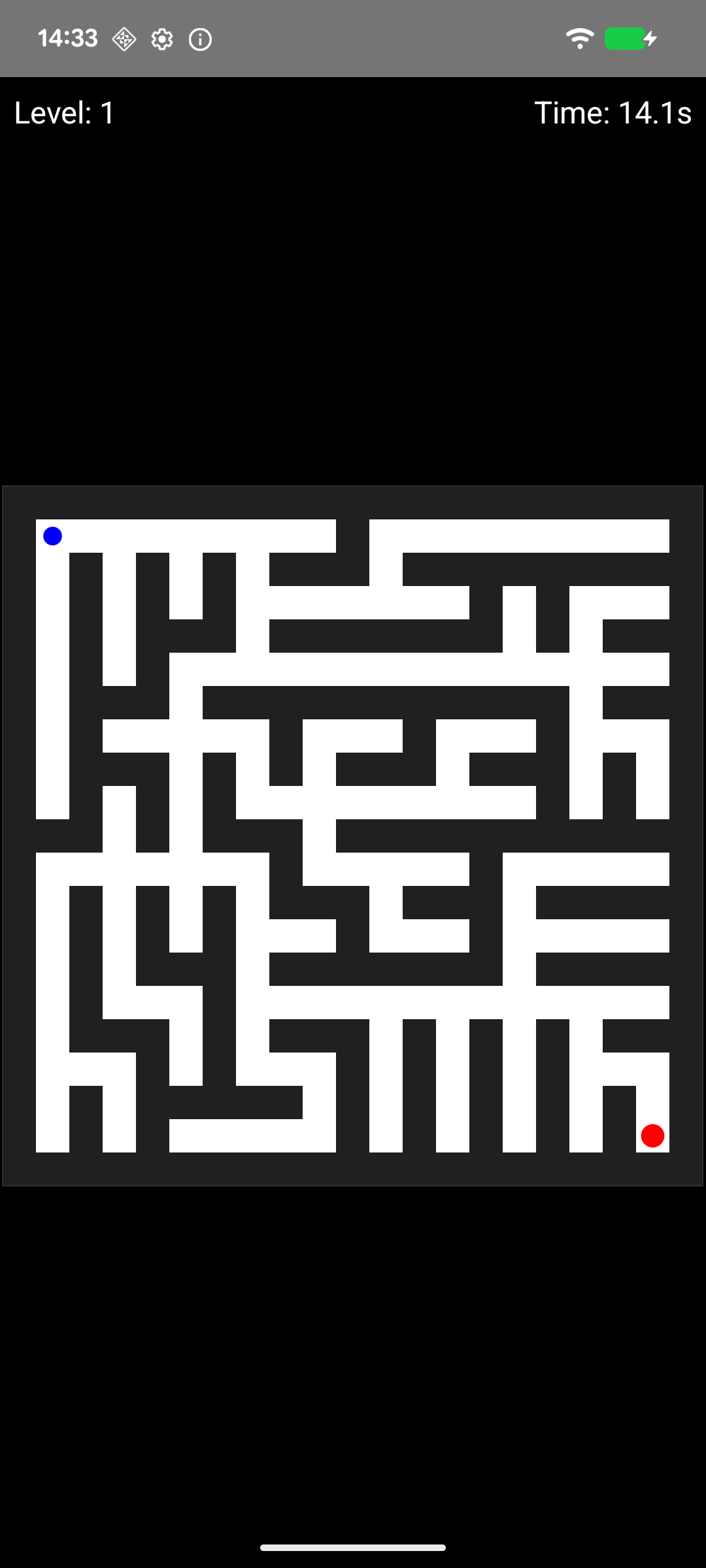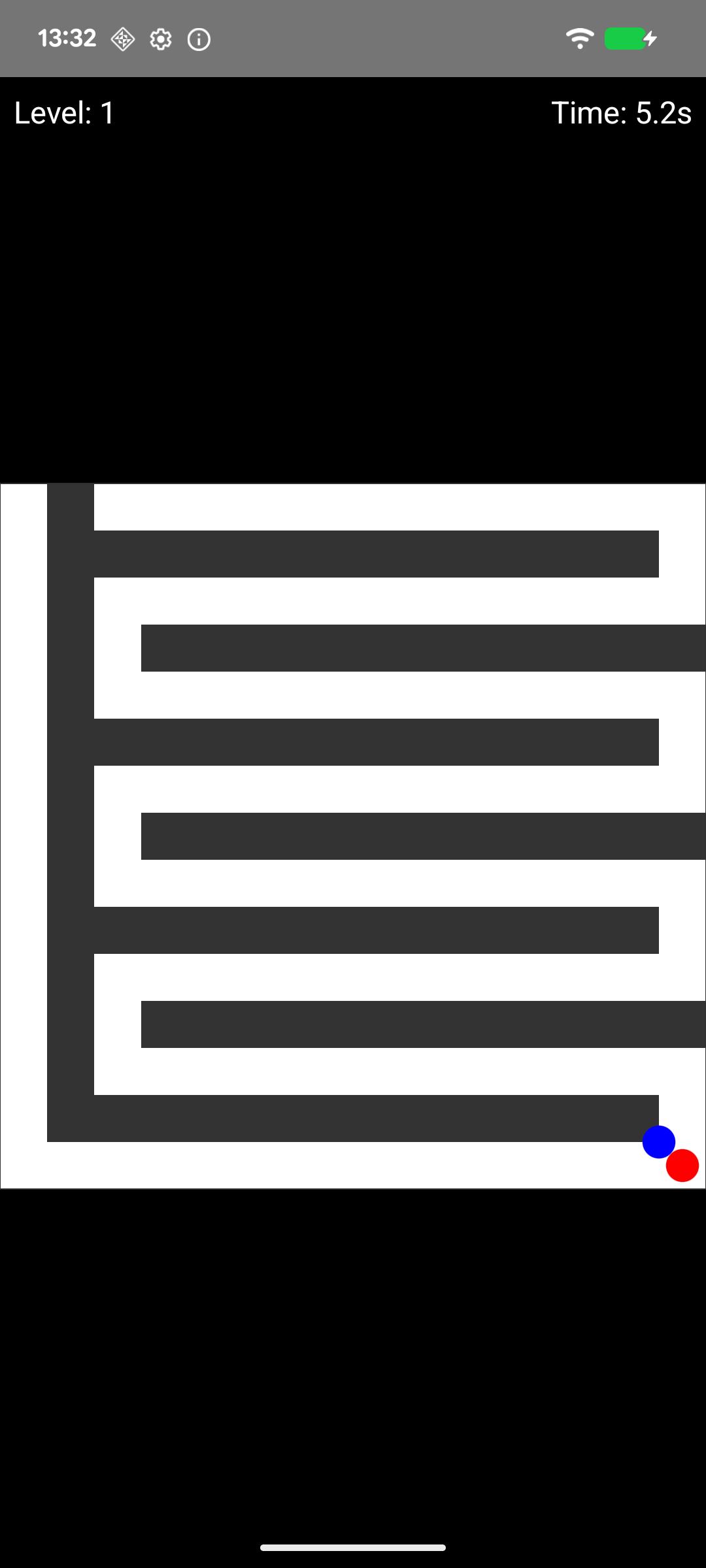- 画面の構成要素は移動可能な通路(◻︎)、移動不可の壁(▫️)、自分の現在地(🔵)、ゴール(🔴)、難易度を表すLevel表記(1からの数値)、制限時間の表記