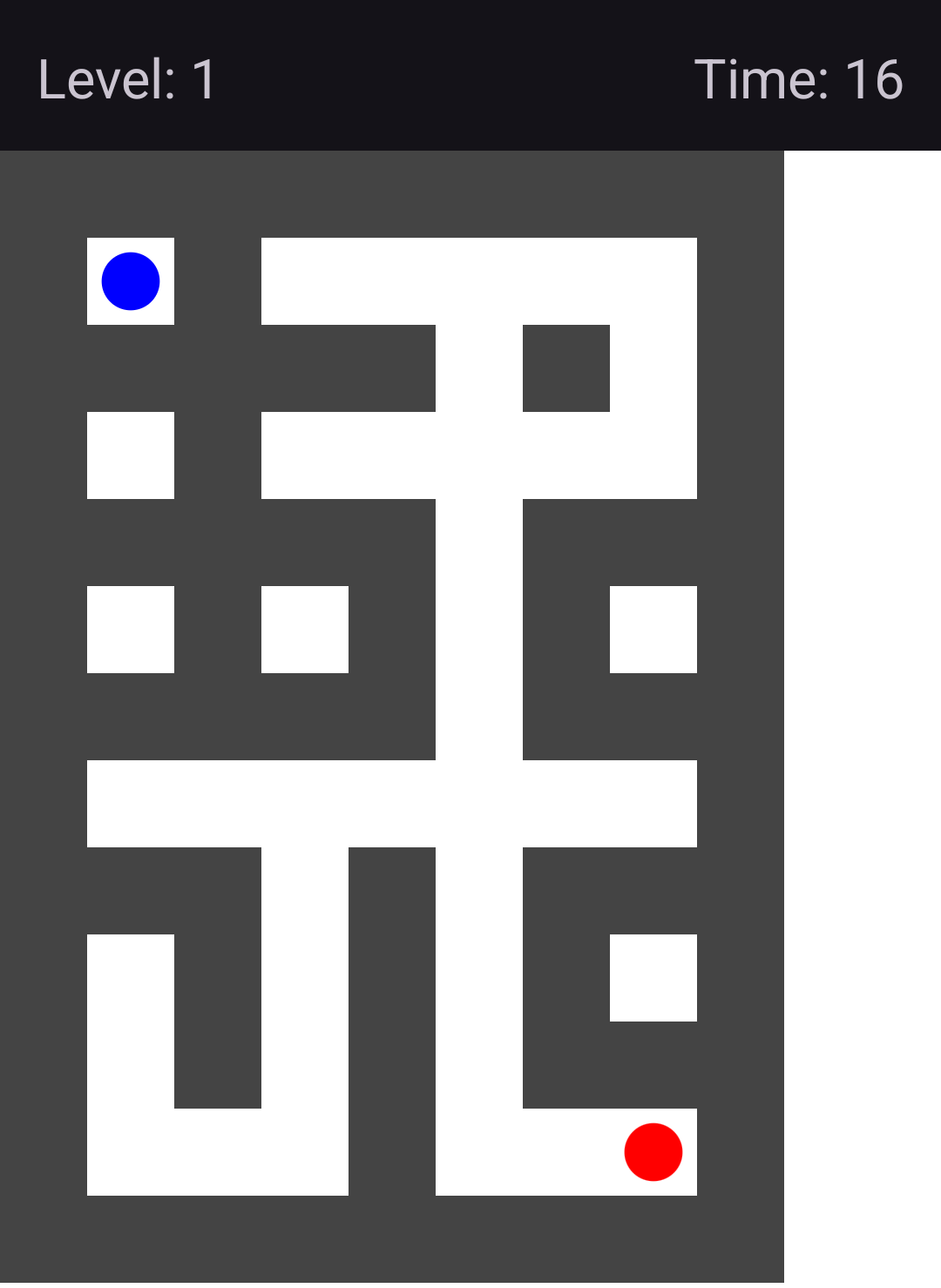・画面の構成要素は移動可能な通路(白)、移動不可の壁(暗いグレー)、自分の現在地(青い丸)、ゴール(赤い丸)、難易度を表すLevel表記(1からの数値)、制限時間の表記