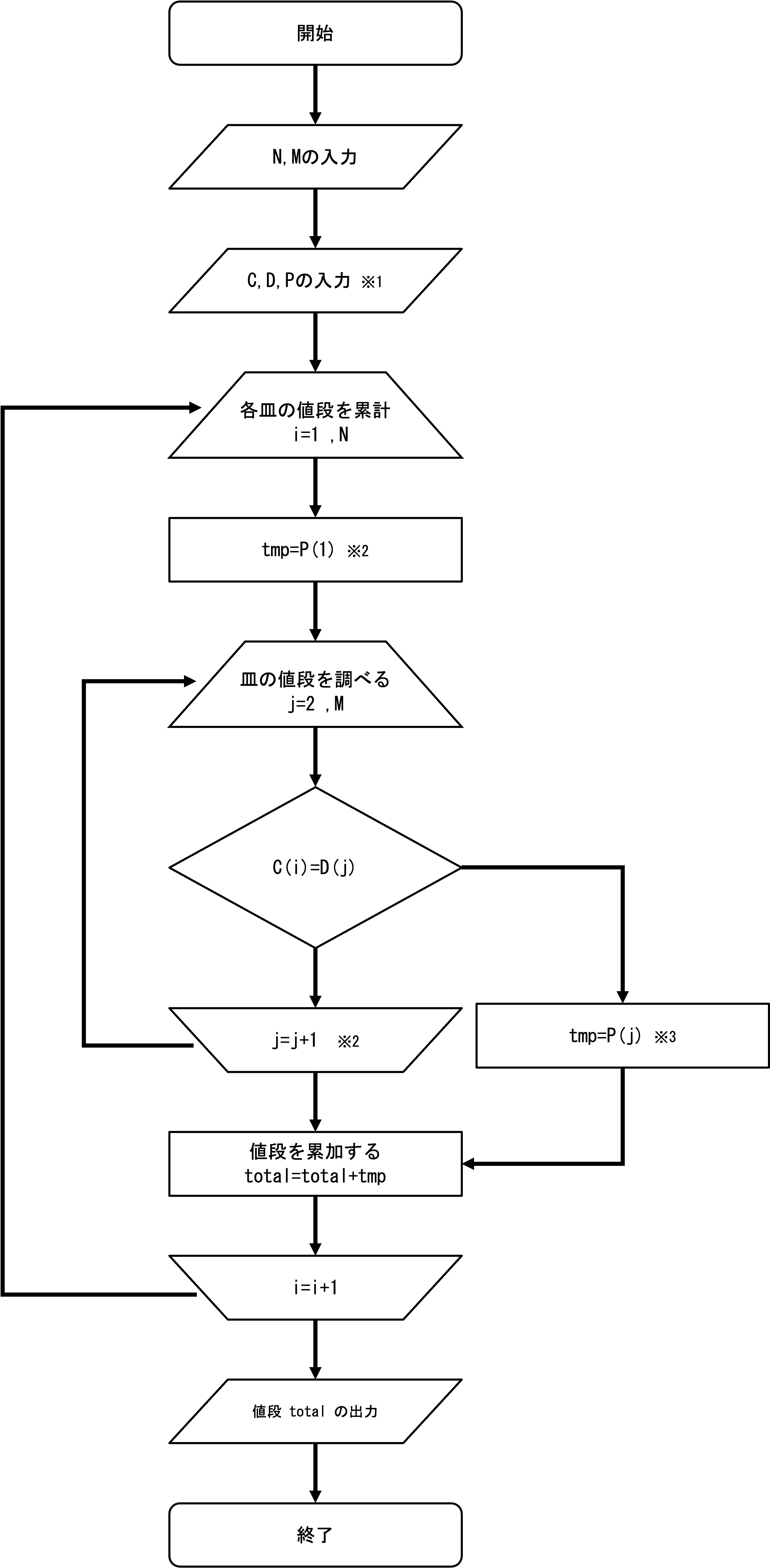 Pは定義されていない色の皿の値段を格納するため、Mよりも1つ配列が大きくなります。