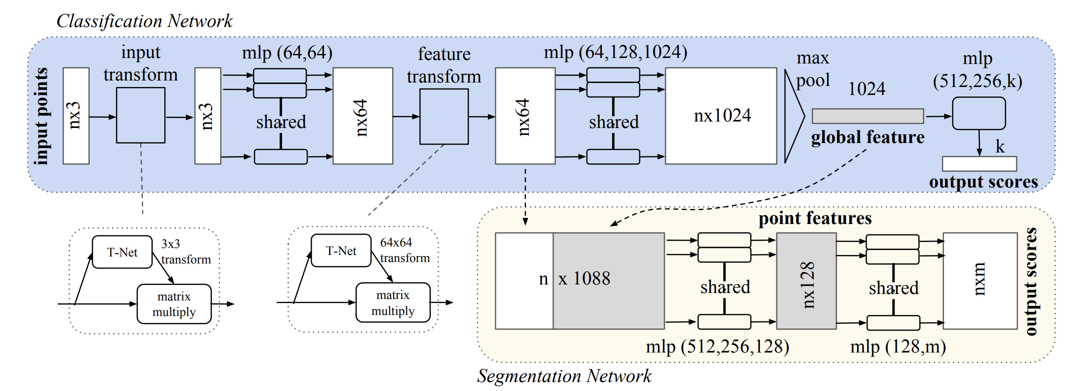 青色の部分はClassification Networkであり、黄色の部分はSegmentation Networkです。その名の示す通り、それぞれClassificationとSegmentationという用途で使い分けされます。