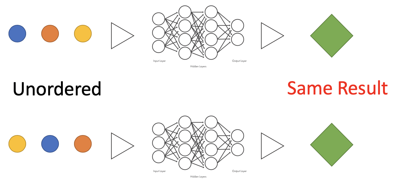 例えば画像であれば形式が2次元行列で固定されているため、あらゆる画像に対して各要素(ピクセル)に規則的に順番を付けることが可能です。それに対して点群データは画像のように決まった形式を持たず各要素(点)に順番を付けることができないため、機械学習モデルに入力する際には毎回異なった順番で点群が入力されることを想定しなければなりません。この時、異なる順列の点群入力に対して機械学習モデルは毎回同じ値を出力すること(不変であること)が求められます。(そうでないとモデルは入力粒子数の階乗の組み合わせを逐一学習する必要がある。)