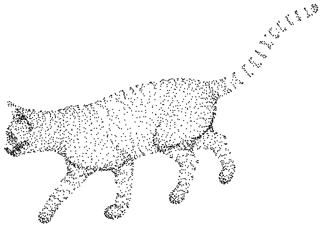 点群データは近年、自動運転の分野で注目されています。というのも自動運転のセンサとして使われているLiDARから得られるデータが点群データであるためです。他には建設業界における三次元計測や分子を対象とした化学計算等で使われており、その応用範囲は多岐に渡ります。(下の猫が点群です。)