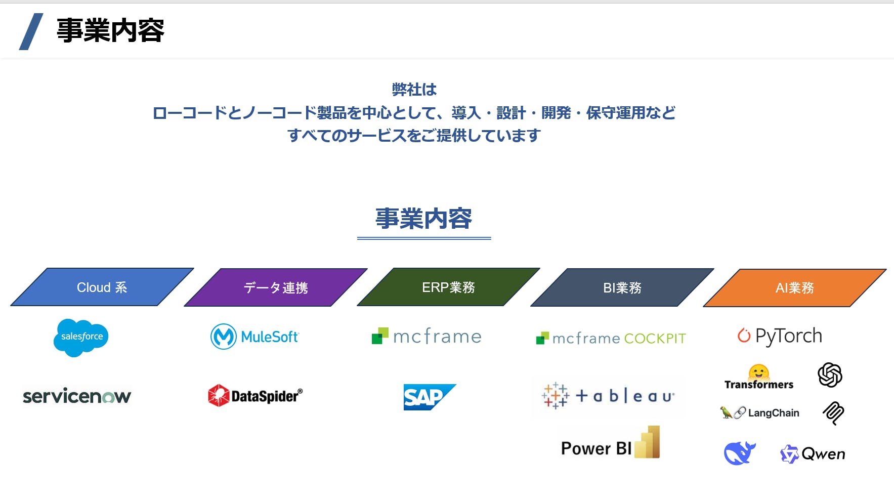弊社は、Salesforceを中心としたクラウド分野の導入・活用コンサルティング企業として、コンサルティングから導入・開発、定着化(オンボーディング)、運用サポート、トレーニングまで、Salesforce活用におけるすべてのサービスをご提供しています。ライフサイクルを通じた継続的なご支援で、お客様の加速度的に変化するビジネスに見合ったシステムの導入・活用をご提案します。