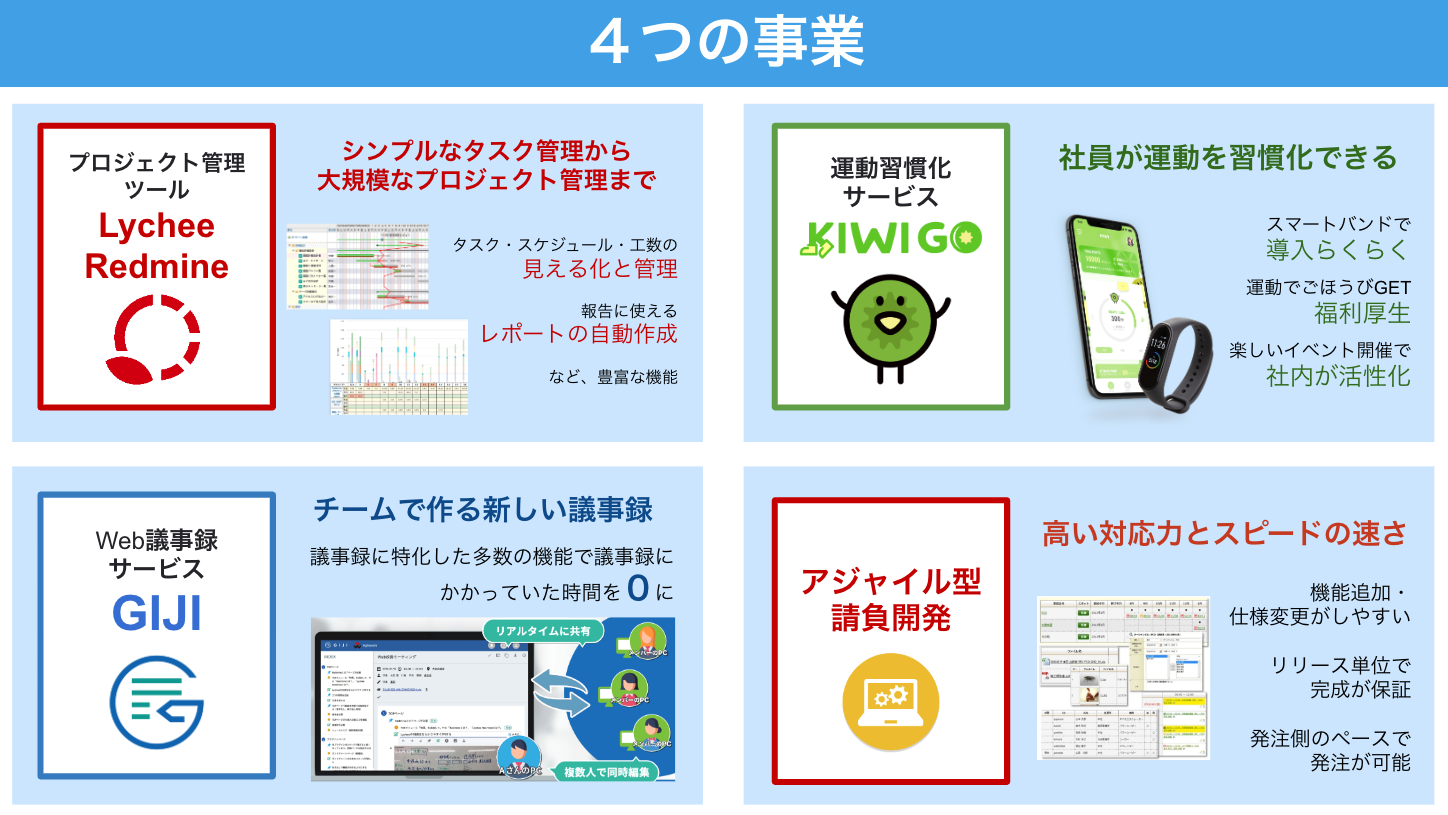 ・運動習慣化&コミュニケーション促進サービス「KIWI GO」の開発・販売・プロジェクト管理ツール「Lychee Redmine」の開発・販売
