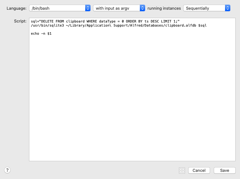 スクリプト自体はとても単純で、SQLite3のclipboardテーブル内の最新の1件を削除します。