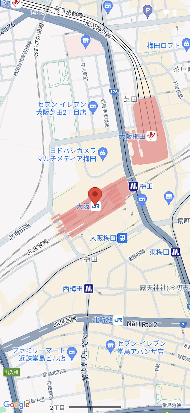 JR大阪駅にマーカーを立てて、 16.0f のズーム率でマップを表示したものです