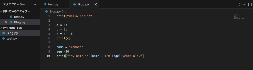 VScodeで伝統のHello World!を記述し、ターミナルで表示されるかチェック。