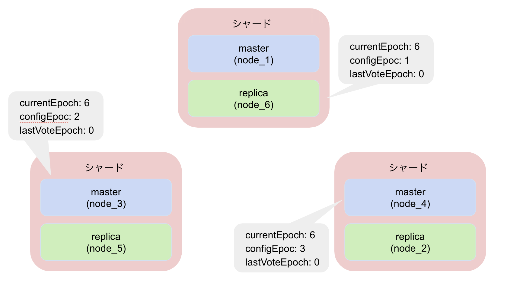 - レプリカは過半数のマスターから投票を受け付けるとマスターに昇格し、configEpochを最新のcurrentEpochに更新する