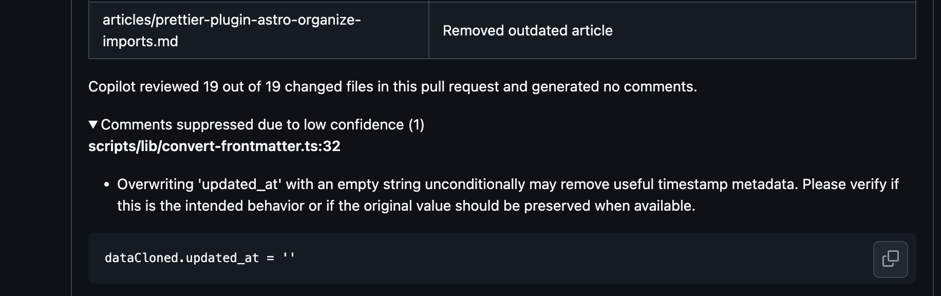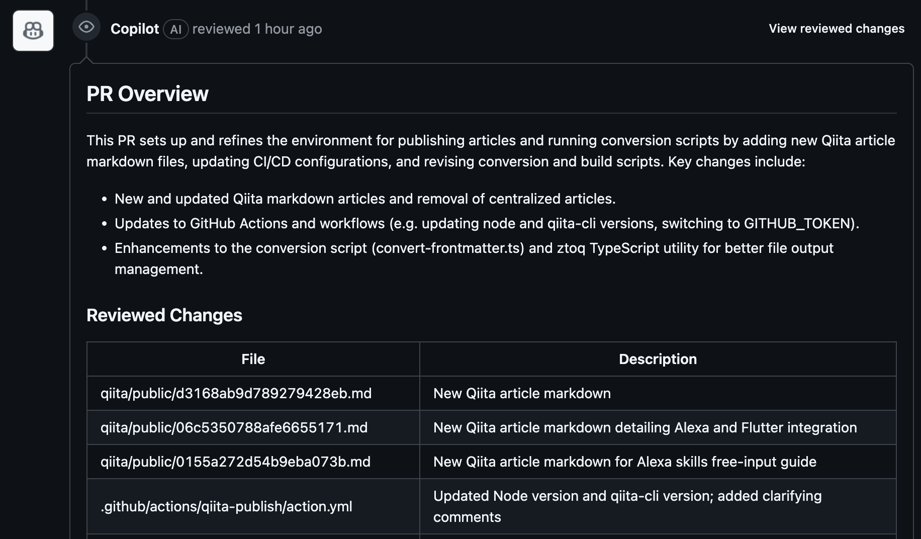 本記事はGitHubでプルリクを作成した際にCopilotがレビューしてくれるようになったので、とりあえず試してみた感想を記載した記事です