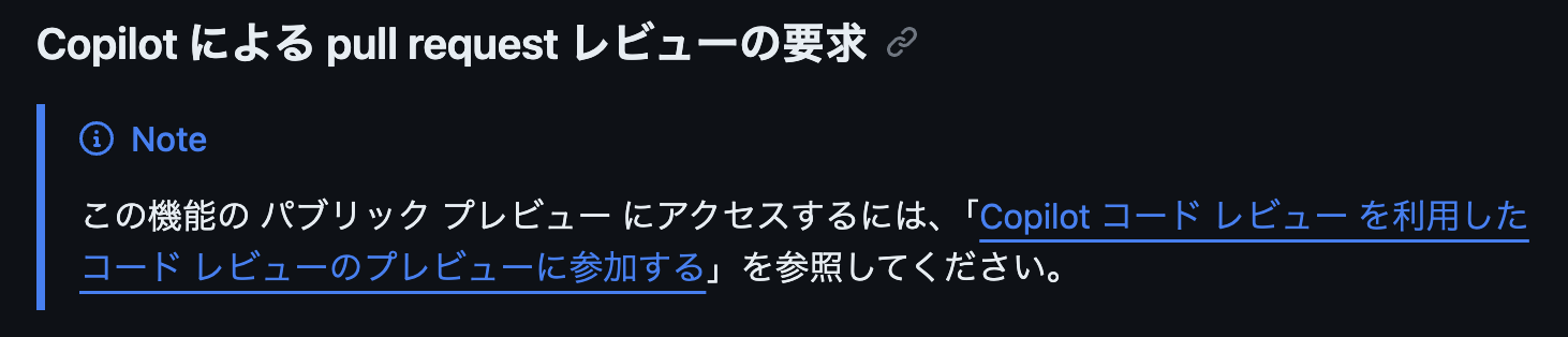 現在(2025/03/08)、「GitHub Copilotのプルリクレビュー」は以下の状態です