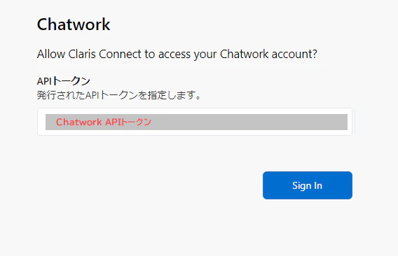 Chatworkへのサインインを求められたのでクリックすると、APIトークンを入れてって言われた。ChatworkのAPI設定からもらってきたやつを入れる。これでアカウントを判別してるんだな