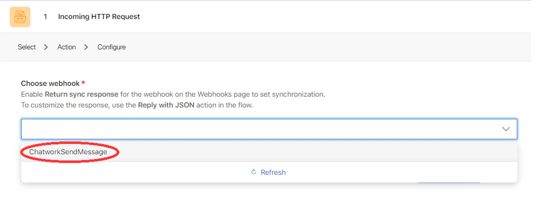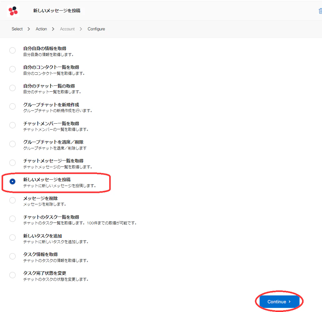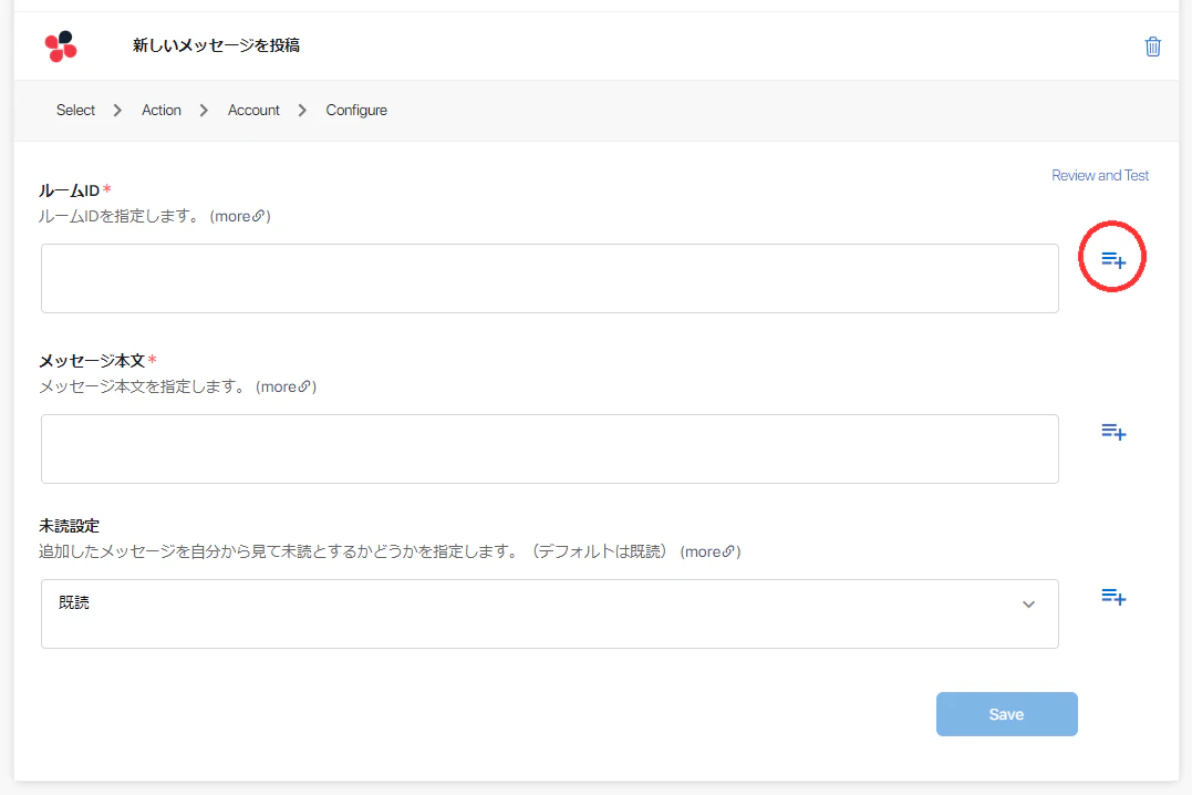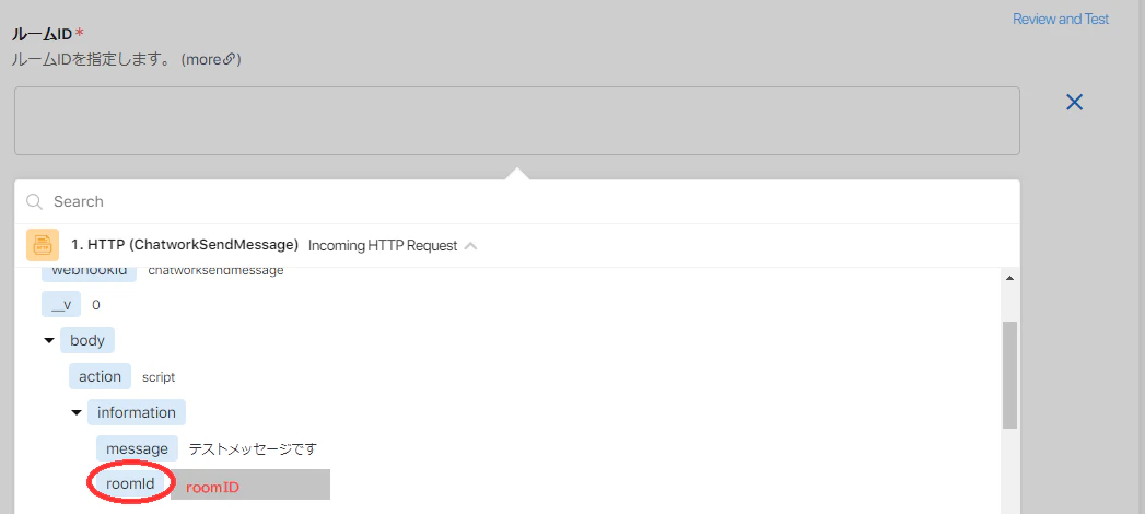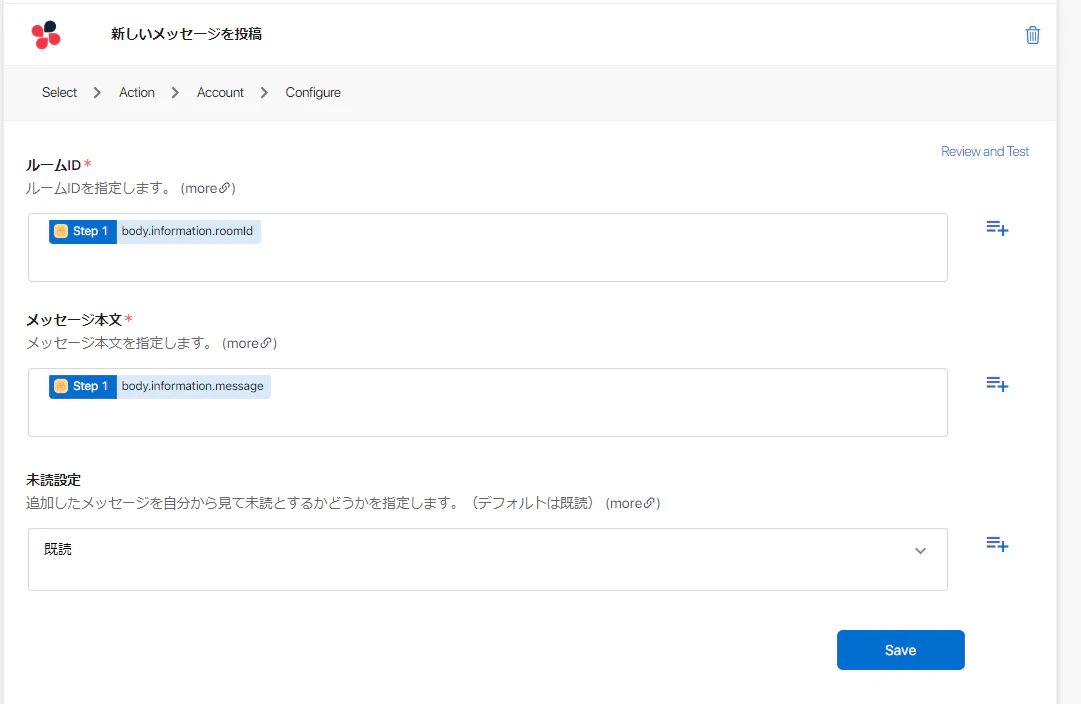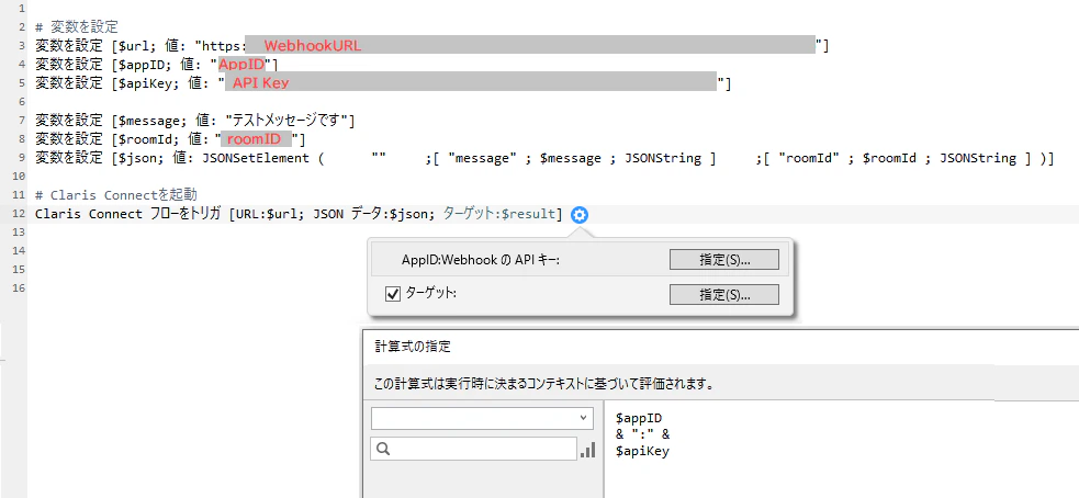 続いてルームIDとメッセージを指定。さっきwebhookを開通させたので、FileMakerで設定した変数がClaris Connectでも変数みたいに選べる~!Connectしてる~!すごーい