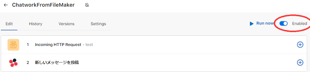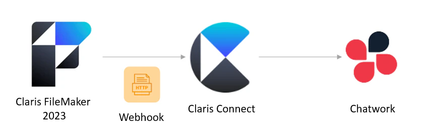 今回は、FileMakerでボタンを押すと、Claris Connectのフローが動いてChatworkにメッセージが送れるというものを作りたい。このうち、FileMakerとClaris Connectは違うサービス?なので、それをなんとか繋がないといけないのだが、それにWebhookという仕組みを使うらしい。WebhookはHTTPプロトコルを使った信号っぽいものらしい。