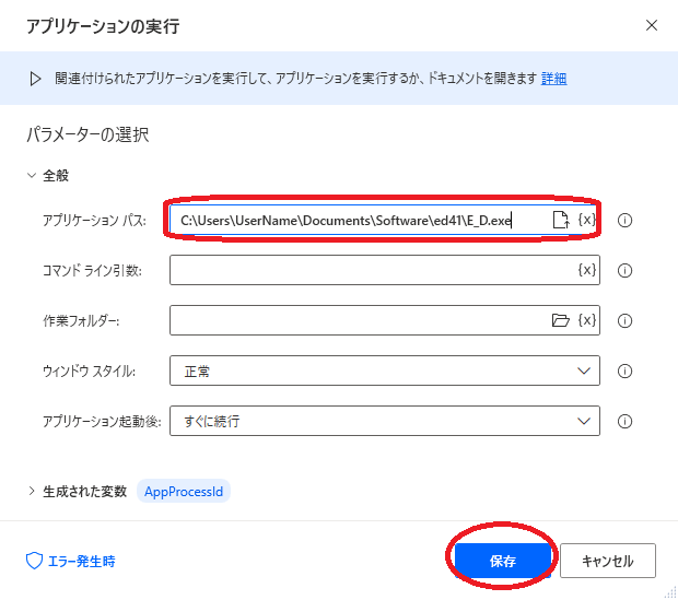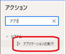 PowerAutomateDestTopに戻って、アクション「アプリケーションの実行」を追加する。検索窓にアプリといれたら「アプリケーションの実行」が出てくるのでダブルクリック。すると必要事項を記入するウインドウが開くので、アプリケーションパスのところに先程コピーしたパスを貼り付ける。""で囲まれていると思うけどそれは消しておく。
