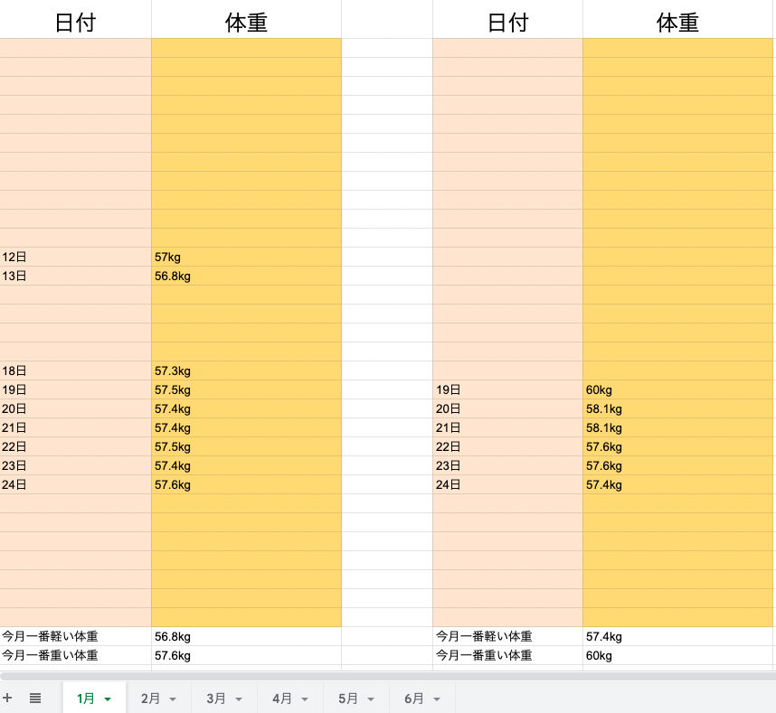 一番下のセルに、"今月一番重い体重"と"今月一番軽い体重"を記録しています。