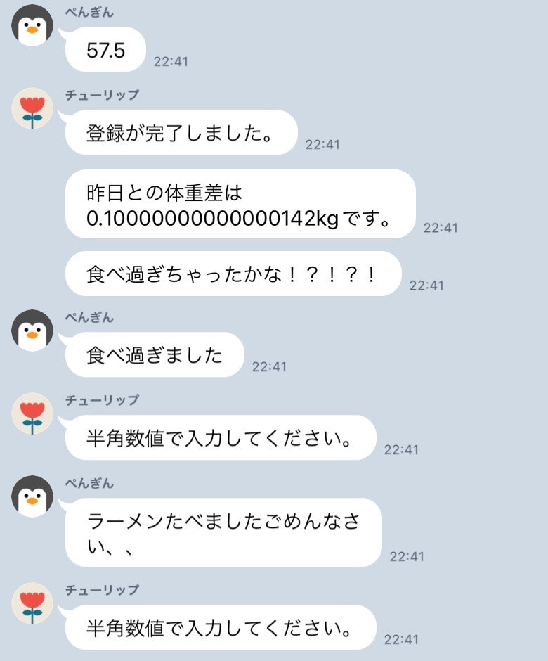 以下は、前日より増えた体重を入力した場合です。(チューリップがbot)