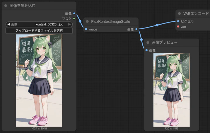 ただし2枚から合成したい場合はFluxKontextImageScaleノードが重要になります。
