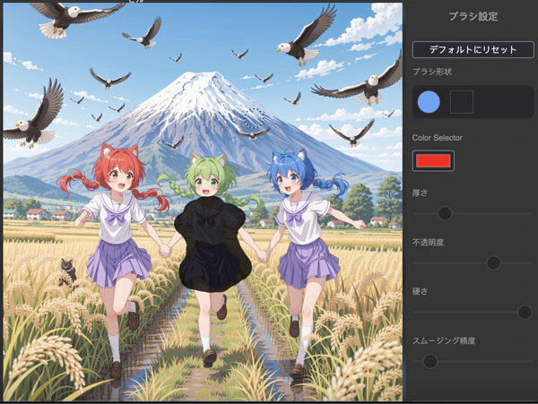 この中に似たような猫耳少女3人います。誰か一人だけ修正したい時どのように説明するかは難しいです。「真ん中の少女」や「緑髪の少女」とかで説明してもうまくいかない場合が多いです。