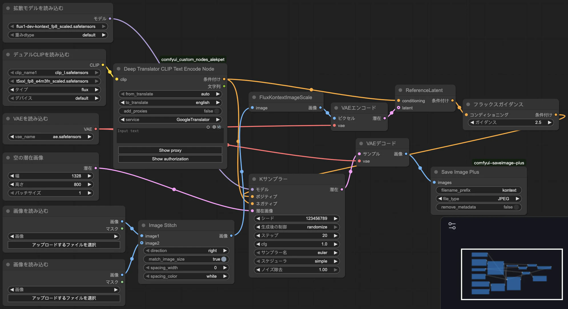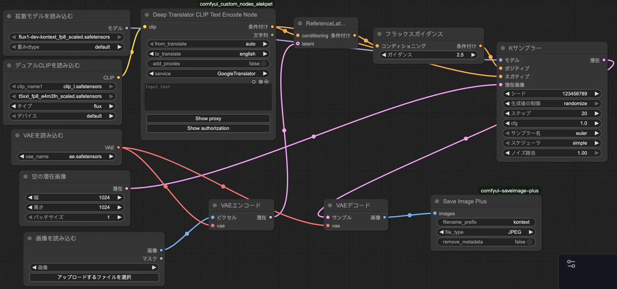 以前の記事と同様、今回もComfyUI_Custom_Nodes_AlekPetのDeepTranslatorCLIPTextEncodeNodeとcomfyui-saveimage-plusのSaveImagePlusノードを本来のCLIPTextEncodeとSaveImageの代わりに使っています。