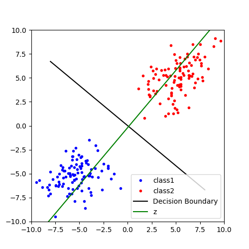 「直線のどちら側にあるかを見る」と言いましたが,実際にデータを識別するときは適当な線形変換によってデータを直線z上に写像すると2つのクラスを判別しやすいと思います.データを1次元に圧縮すれば,閾値となるスカラー値を適当に設定してどちらのクラスに属するのか判別できますね.フィッシャーの線形判別分析は,この射影先の直線zを見つけるための手法の1つです.